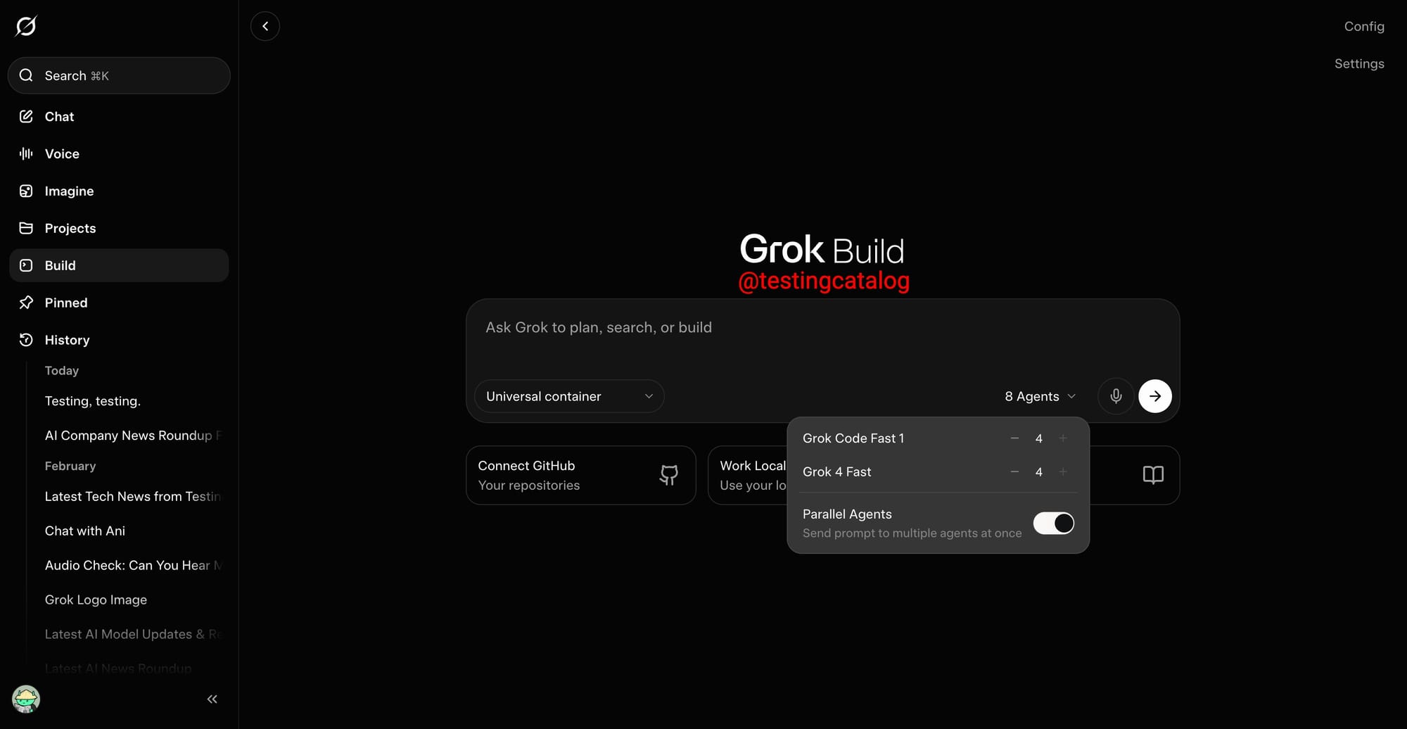 xAI is testing Arena Mode with parallel agents for Grok Build. The platform is evolving into a full IDE with multi-agent coding, dictation, browser-style tabs, and GitHub integration.